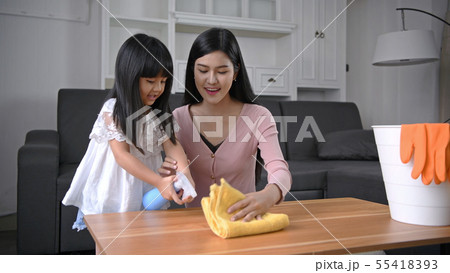 Cleaning concept. Mother and daughter help with