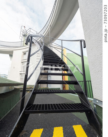 Outdoor stairs of an escape exit in a factory. Yellow markings on the floor