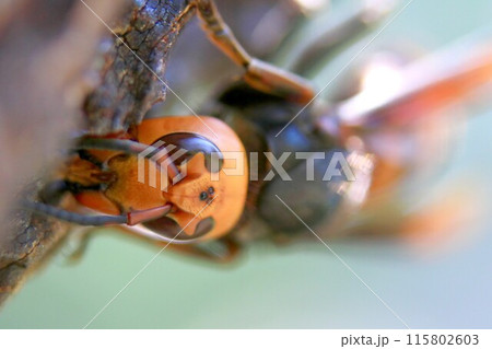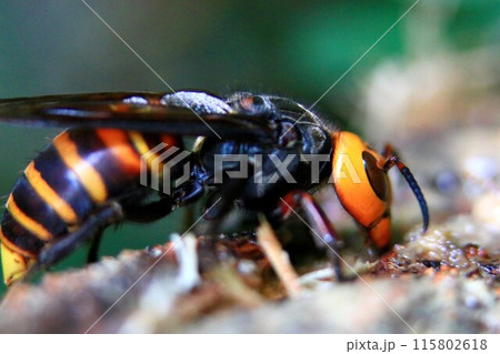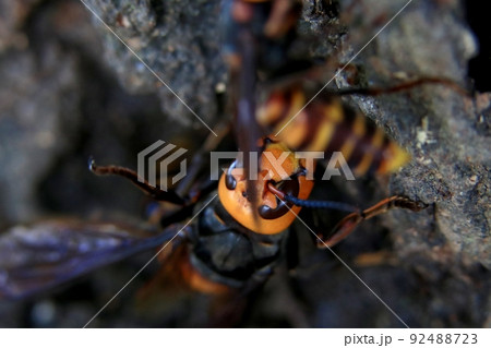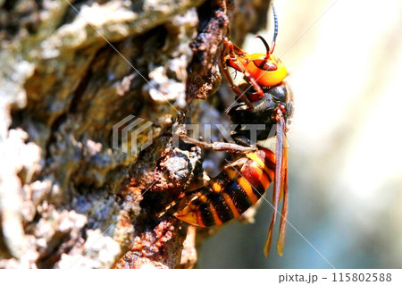毒針を持つ危険なオオスズメバチの女王蜂が自然の樹液を採餌中