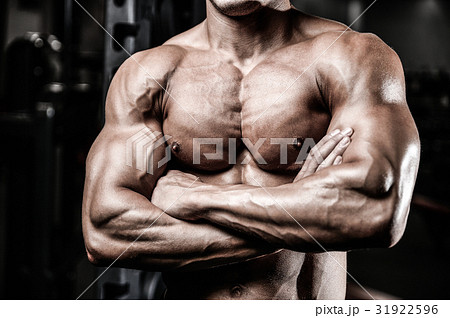 Brutal caucasian handsome fitness men on diet training chest pum