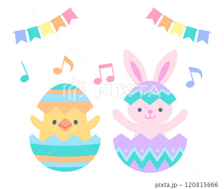 イースターエッグから飛び出すうさぎとひよこのイラスト