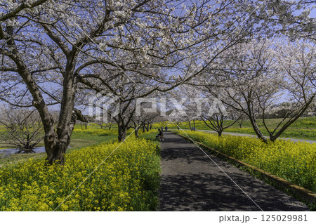 茨城県筑西市母小島遊水地に映る菜の花と桜並木