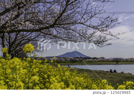 埼玉県筑西市母小島遊水地から菜の花畑と桜に彩られる筑波山