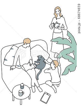 リビングでくつろぐ3人家族と猫 線画