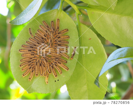 生き物 昆虫 チャドクガ、行儀よく並んで食事中の幼虫。注意して手早く駆除しないと大変なことに・・・