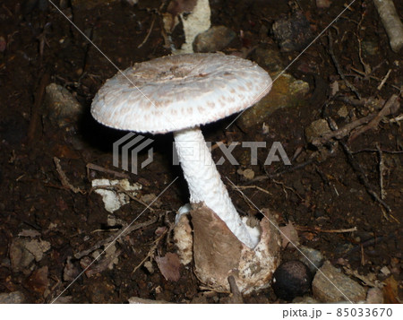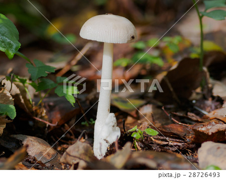 自然 茸 ドクツルタケ、純白の美しい猛毒キノコ。鍔と壺とささくれた柄、傘は十センチ前後