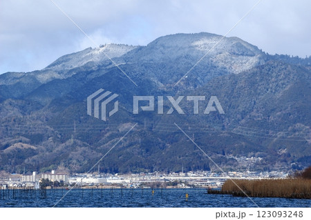 強風で波立つ琵琶湖の湖面と雪化粧した比叡山
