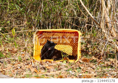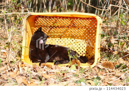 雑木林に置かれた黄色い籠の中で毛ずくろいをしてる野良猫