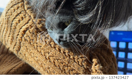 Adult female arms strokes head of cute gray cat lying on her knees at home. Hands of woman petting adorable domestic kitten at house. Concept of care and love to animal. Slow motion