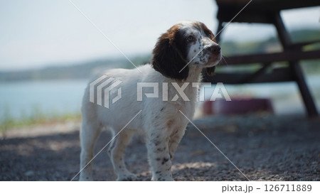 Adorable white puppy for adoption or rescue for animal, hoping for a loving home, a chance at a new life, benefiting from the care of volunteers, affection and trust or support pet shelter. Hungry dog