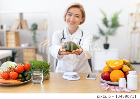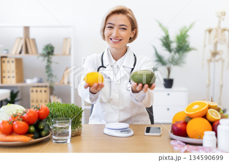 A smiling nutritionist in a white coat holds a lemon and avocado, surrounded by fresh produce, promoting healthy eating.