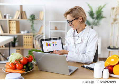 A dietitian explains nutrition using a tablet and laptop, surrounded by fresh fruits and vegetables.