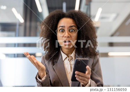 Close-up portrait of a shocked young African-American businesswoman sitting in a suit in the office at the desk, holding the phone and looking worriedly at the camera.