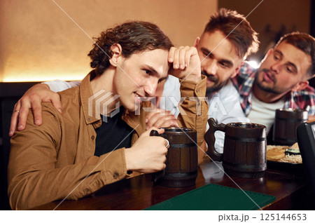 Supporting a sad man. Three friends are in the bar drinking beer and having a good time