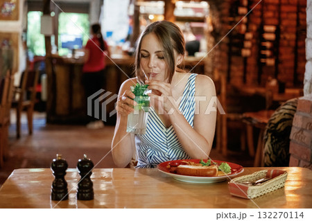 Drinking the mojito. Woman is in the restaurant with food and drink