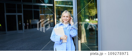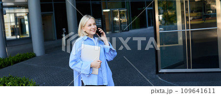 Image of young office woman, employee standing near company building with documents and notebooks, answers phone call, talking on smartphone and smiling, wearing blue collar shirt
