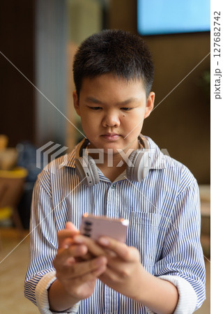 Thai boy using phone at cafe with headphones