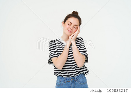 Image of tender woman, 25 years, holds hands near face and closes eyes, sleeps, smiles pleased during nap, isolated against white background