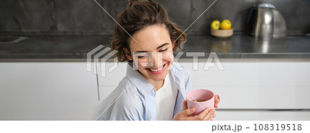 Portrait of smiling, beautiful young woman, drinking coffee in kitchen, morning magic with cuppa tea, looking tenderly
