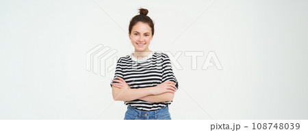 Portrait of attractive, stylish young woman, 25 years old, wearing t-shirt, cross arms against chest and smiling, looking confident, isolated over white background