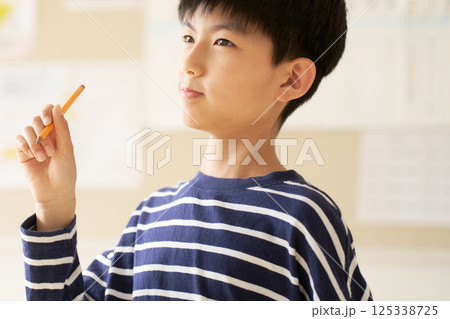 ノートと鉛筆を持って考え中の高学年男子小学生