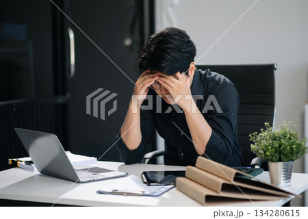 Young man experiencing headache. Holding his hand to his forehead. Feeling stressed. Depressed. And frustrated. Facing emotional struggle. Mental health issues. Grief. Sorrow