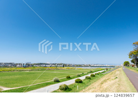 多摩川河川敷のサイクリングロードを散歩する 春の青空 東京都調布市