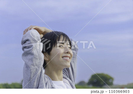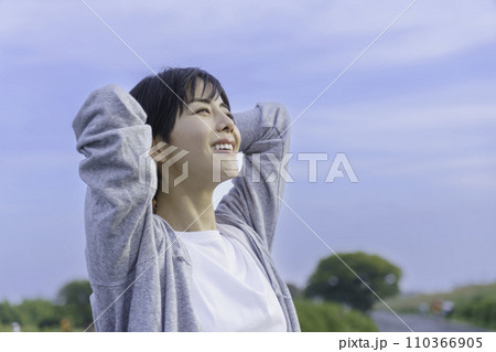 土手で青空を見上げる若い女性