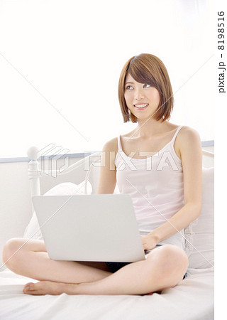 ベットパソコン操作する若い女性