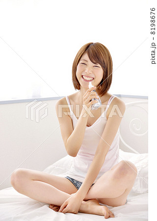 ベットの上でゼリーを飲む女性