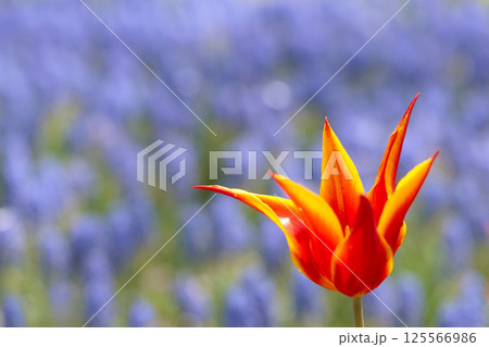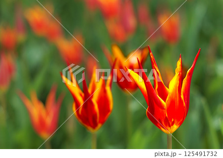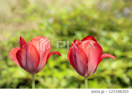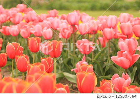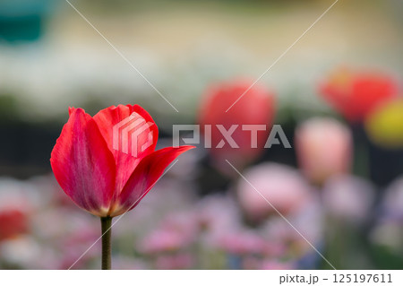 春の陽光を浴びて色とりどりに輝くチューリップ