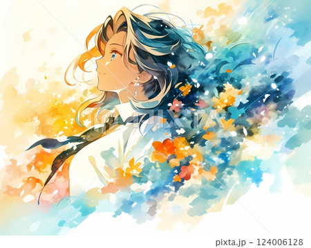 凛とした希望に満ちた眼差しで前を見つめる女性と花々