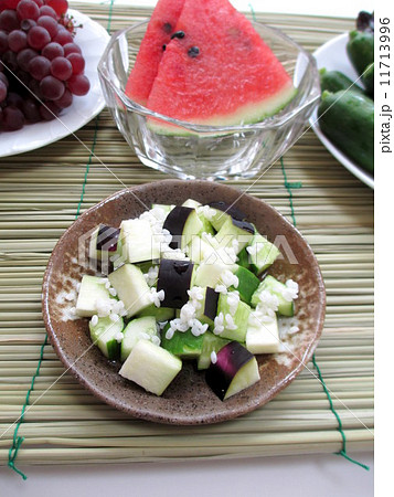 お盆 盆棚に敷く真菰(まこも)とお供え物の水の子と夏野菜とくだもの The seasonal vegetables and fruit of an offering thing