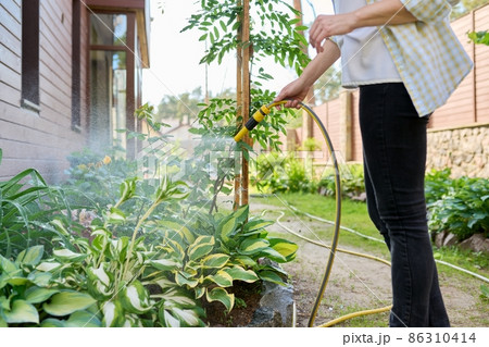 Woman watering flowerbeds with a hose in garden