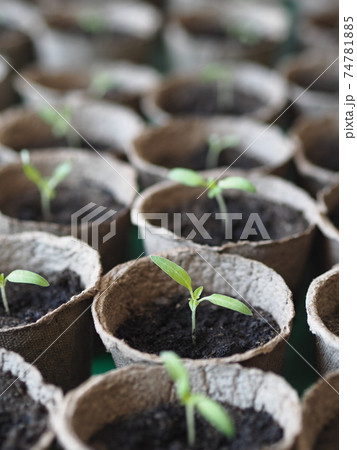 Seated small sprouts of tomatoes in peat cups.Spring agricultural preparatory work.