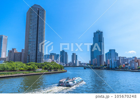 日本の東京都市景観 中央大橋を通過した水上バス「エメラルダス」や大川端リバーシティ21などを望む