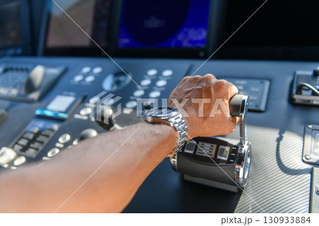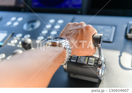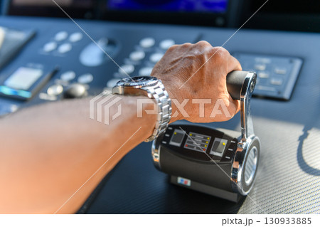 A close up view of a yacht or ship bridge with a captains hand operating the throttle controls.