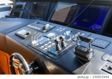 A close up view of a yacht or ship bridge with the throttle controls. The navigation radar screen and electronic control panels are visible in the background