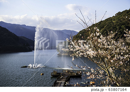 桜の花が咲く季節に映える 奥球磨県立自然公園・市房ダム風景 (熊本県球磨郡水上村湯山)