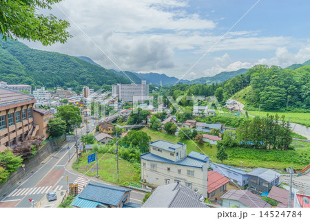 夏の水上町の湯原神社の境内に鎮座する三峰神社の境内から見た水上町の風景