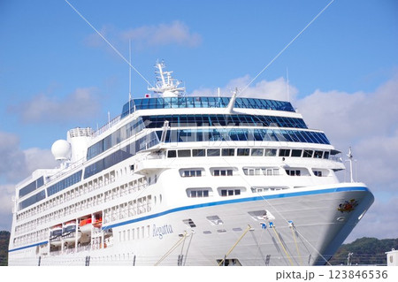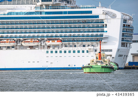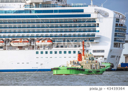 秋の北海道函館市函館港に寄港するクルーズ船の水先案内をするタグボートの風景を撮影