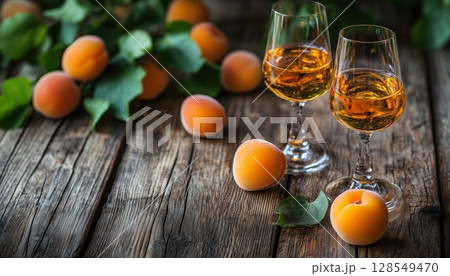 Fresh Apricots And Apricot Liqueur Or Grappa Displayed On An Antique Wooden Table In A Rustic
