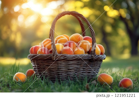 Wicker basket overflowing with freshly picked apricots in orchard sunlight