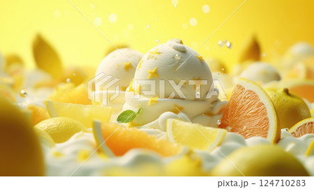 Citrus ice cream with flying fruit slices ingredients, dessert food background