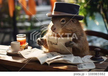 Capibara in hat is reading the newspaper