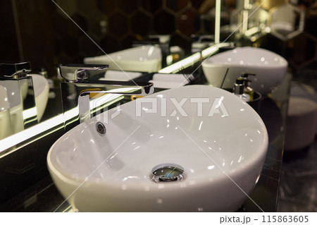 Modern bathroom sink with counter and accessories, designed for clean minimalist interior