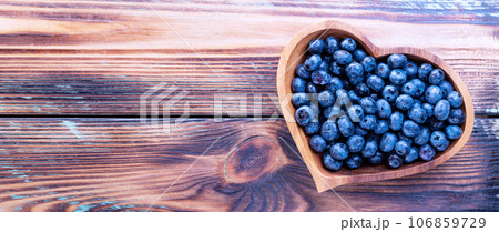 Freshly picked blueberries in a heart-shaped wooden plate on a wooden table, top view