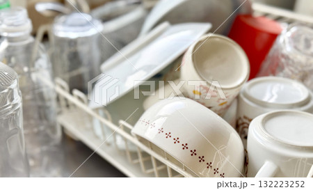 水切りラックに積み重なった洗い済みの食器やお皿
