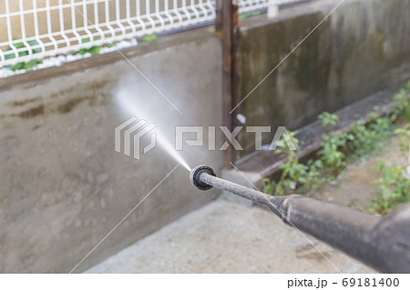 高圧洗浄機でコンクリートの汚れを落とす場面(ノズルにピント)