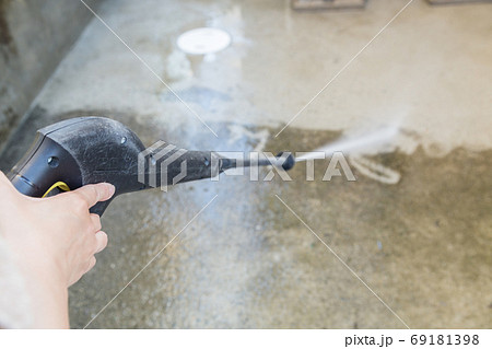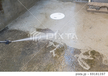 高圧洗浄機でコンクリートの汚れを落とす男性
